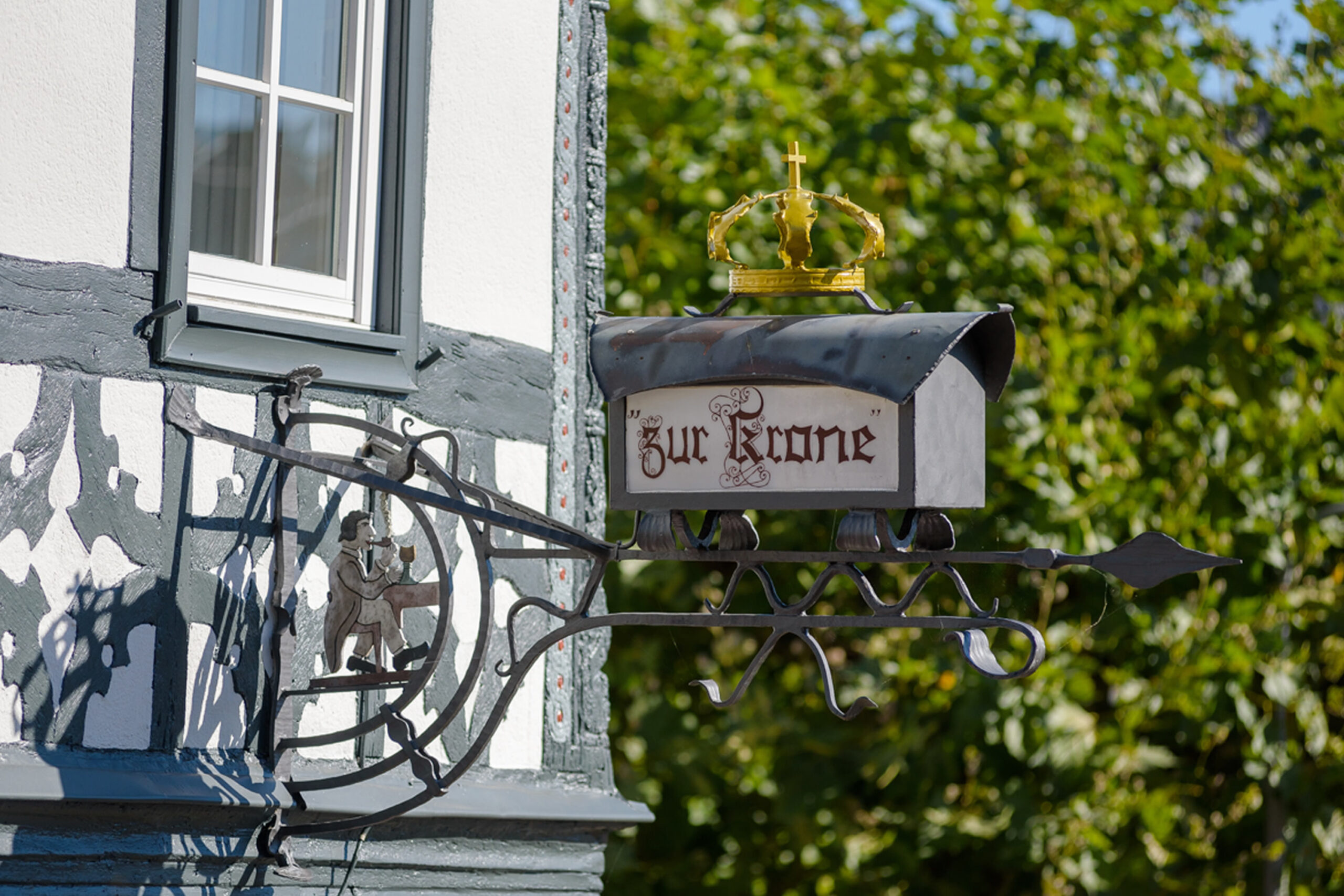 Die Krone in Martinsthal ist ein Stück lebendige Dorfgeschichte. Seit Jahrhunderten prägt das Gasthaus am Marktplatz neben der alten Kirche St. Sebastian und Laurentius das Ortsbild. Ursprünglich war die Krone das Rat-, Back- und Wirtshaus von Martinsthal. Erbaut im Jahre 1528 war sie Mittelpunkt des Ortsgeschehens. Das kunstvolle Fachwerk mit dem markanten Erker bestimmt bis heute ihr Aussehen.